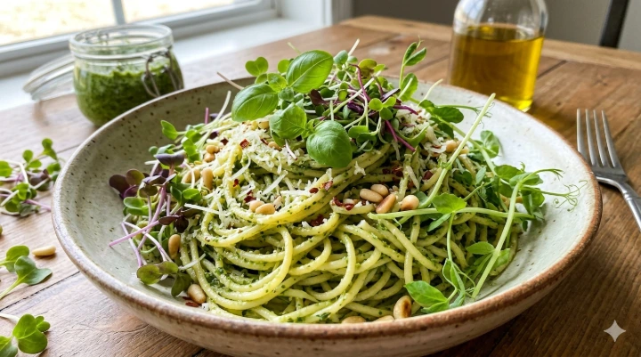 2. In a mixer, add microgreens, nuts, garlic, olive oil, salt, and pepper.